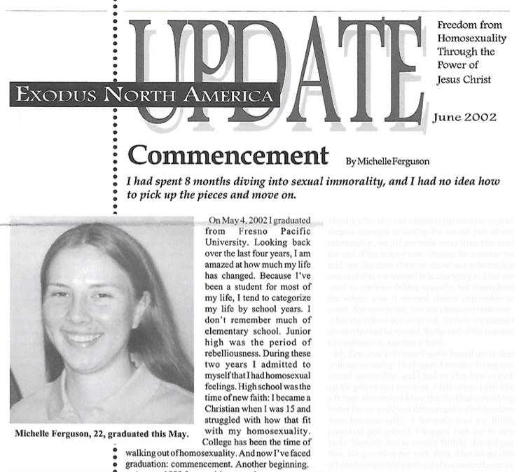 Days after graduating from college, I boarded a plane from California to Orlando, FL. Alan Chambers, Executive Director of Exodus International, invited me to join the Exodus team and I accepted, believing that God was calling me to use my story to help others find “freedom from homosexuality through the power of Jesus Christ.” My job as Publications Manager was essentially to be the ex-gay storyteller. I worked to help others share their testimonies of “freedom” and crafted communications that promoted the message of “change.” I was 22 years old. I had been shaped by the ex-gay narrative since my parents found out about my same-sex attractions when I was 15. They turned to Exodus’ message to “save” me. It was like a dream come true to join this ministry as my first job out of college. I thought, This is what faithfulness to God looked like. This was a place I could belong. I could make a difference here. Though I left the staff 10 months later, the narrative shaped my life for another 10 years.